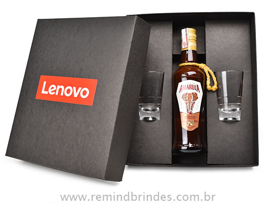 Kit composto por 1 garrafa de Amarula 375 mL, 2 copos. Kit é acondicionado em caixa preta de papel kraft 400 g. A personalização é na tampa da caixa em silkscreen a 1 cor. Não está inclusa a personalização nos copos..
