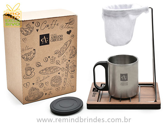 O Kit Cuador de Café com caneca de inox é um presente retrô que faz muito sucesso. Ele permite você fazer um cafezinho fresco a qualquer hora. Por isso, este presente é muito procurado pelas empresas.