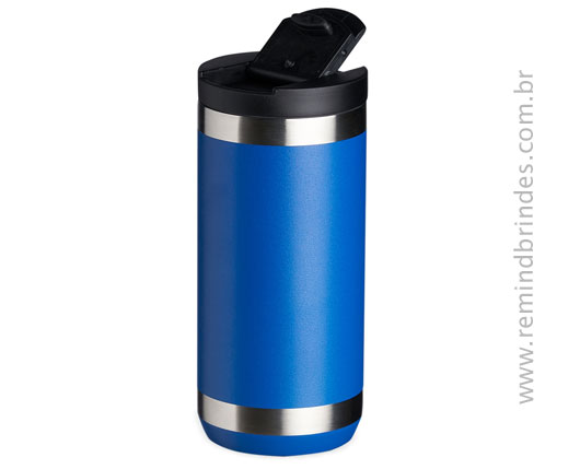 Copo térmico de inox, com capacidade para 350 ml e parade dupla. A tampa plástica possui bocal e trava de segurança. Personalização em silkscreen 1 cor. Formato 7,4 x 16 cm.