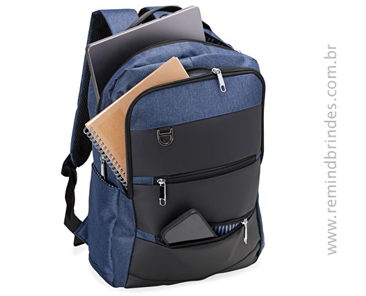 Mochila de nylon com capacidade de 26 Litros, com detalhes em couro sintético e quatro compartimentos, sendo o principal com bolso para notebook 15,6. Inclui divisórias internas para acessórios, a mochila possui bolso lateral, suporte externo USB e alça para engate em malas de viagem. A personalização é feita a laser na chapinha metálica e afixada na frente da mochila. Formato 32x42x20 cm.