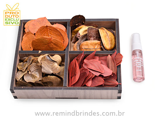 Caixa é produzida em madeira MDF pintada à mão. Acompanha 4 tipos de folhas secas e pulverizador de aroma. A personalização é feita na cinta da caixa de MDF e no rótulo do pulverizador. O produto é embalado com shrink (plástico termoencolhível). Medida 19,5 x 15,5 x 3,5 cm..
