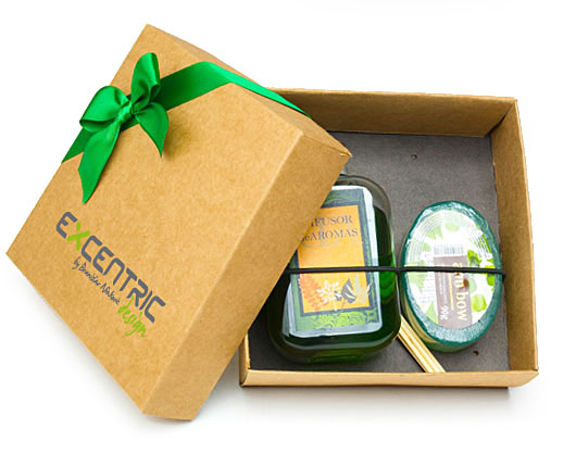 Difusor de aromas com 5 varetas de madeira, acompanha 1 sabonete glicerinado e é embalado em caixa de papel kraft com laço opcional da tampa. Formato da caixa 15x15x5 cm.. Substituir pelo kit Ache