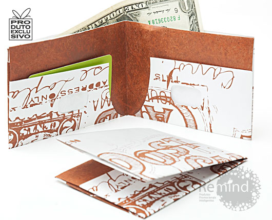 As carteiras tradicionais todo mundo já conhece. Por isso, a Remind está trazendo ao mercado promocional uma carteira de papel resistente a rasgo, que você pode personalizar totalmente. Além de um design exclusivo, ela também é resistente a água, ela é confeccionada com papel de alta tecnologia - Tyvek. Se para a sua campanha, personalização é importante, conheça a carteira de papel da Remind. Ela foi criada para ser um produto de alto impacto. Faça diferente, faça bem feito, faça com a Remind.