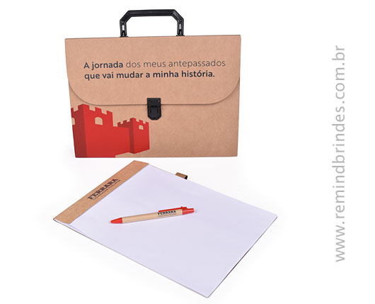 Pasta maleta confeccionada em kraft 400g ecológico com alças e fecho plástico. Acompanha 1 bloco em 20 fls de papel reciclado e 1 caneta ecológica de papelão. Incluso impressão serigráfica em 1 cor na pasta, na testeira do bloco e na caneta. Formato da pasta é 32 x 23,5 x 2,5 cm