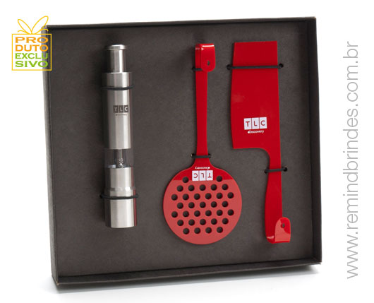 Presentear com acessórios de cozinha é muito útil, para ambos os sexos. A cada dia que passa os homens estão mais envolvidos com a culinária, basta ver na TV a quantidade de programas, incluindo os "realitys shows" que estão batendo recordes de audiência. A Remind, sempre atenta as novas demandas de brindes exclusivos, criou este kit para você presentear os seus clientes. Peça um layout sem compromisso. Faça diferente, faça bem feito, faça com a Remind, a empresa mais criativa do mercado promocional de brindes.